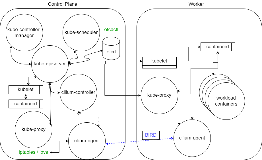 The kubelet interacts with the underlying container engine also installed on all the nodes, and makes sure that the containers that need to run are actually running. The kube-proxy is in charge of managing the network connectivity to the containers. It does so through the use of iptables entries. It also has the userspace mode, in which it monitors Services and Endpoints using a random port to proxy traffic via ipvs. A network plugin pod, such as cilium-xxxxx, may be found depending on the plugin in use.